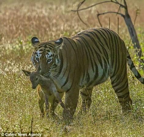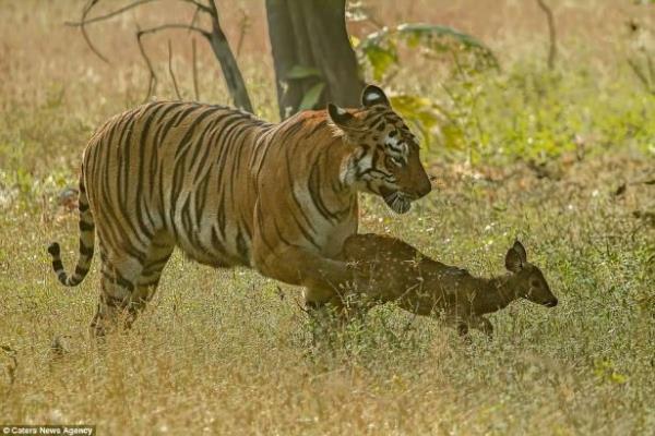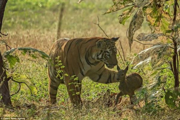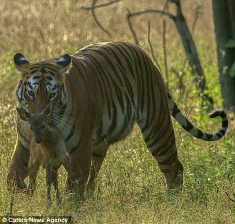 Daily Mail'de yer alan habere göre, dişi kaplan yavru geyiğe tıpkı yavrusuymuş gibi davranarak ağzında taşıyor. Kaplanın küçük geyiği yalayarak temizlediği de görüldü.