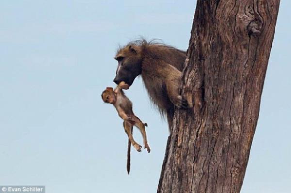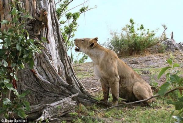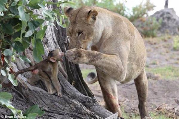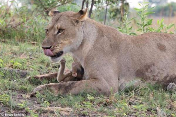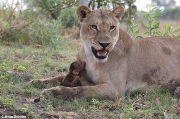 Fotoğrafçı Schiller, aslanın babun yavrusunu öldürmesini beklerken aslan yavruya sahip çıkıyor ve
