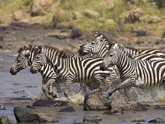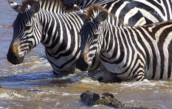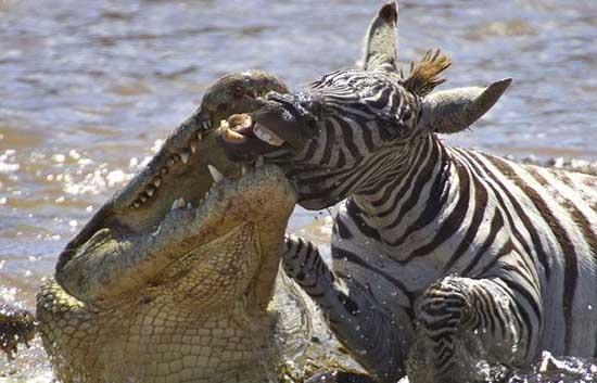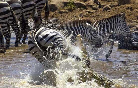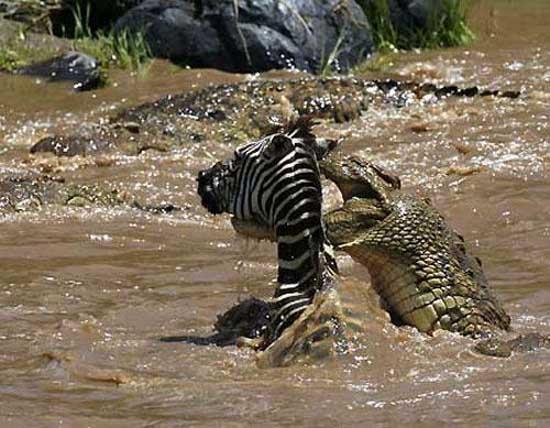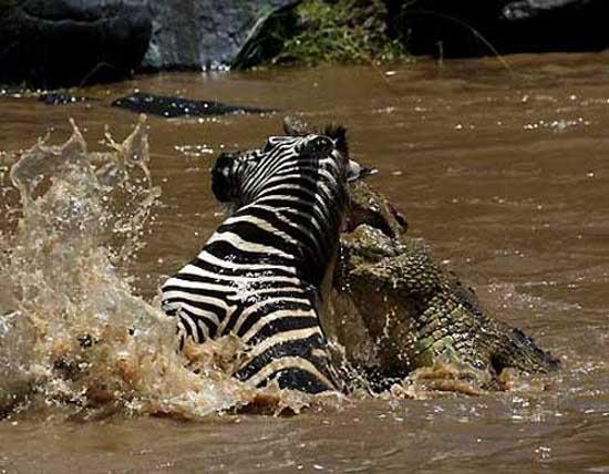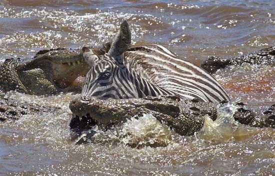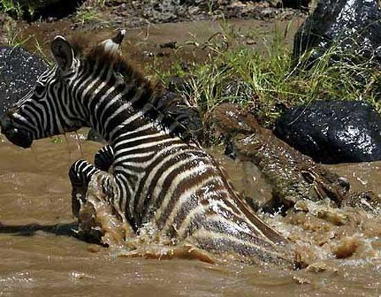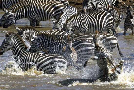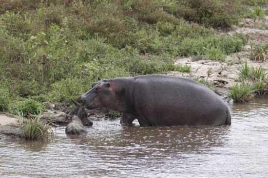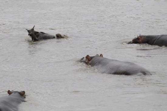 Sürüden bir su aygırı uzun bir mücadelenin ardından antilobu timsahın avı olmaktan kurtarıp, kıyıya doğru yüzmesini sağladı.