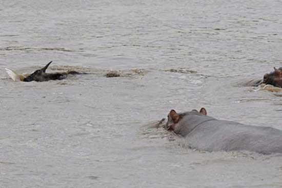 Suyun içinde sürüklenen yavru antilop, timsahın avı olmaktan son anda su aygırının müdahalesiyle kurtuldu.