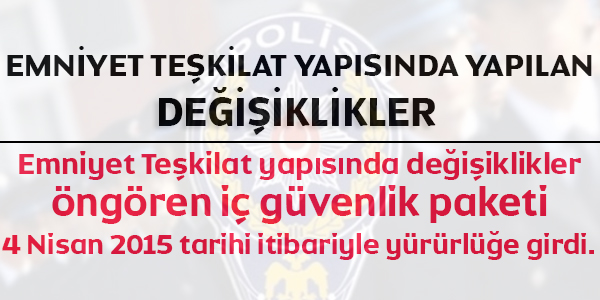 Emniyet Teşkilat yapısında değişiklikler öngören iç güvenlik paketi 4 Nisan 2015 tarihi itibariyle yürürlüğe girdi.