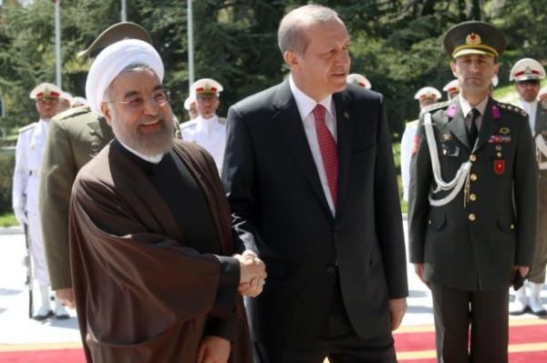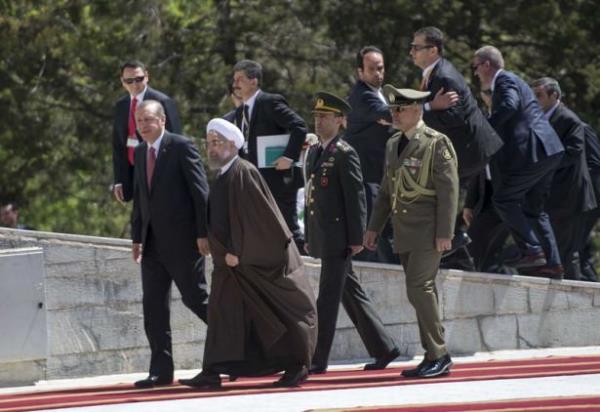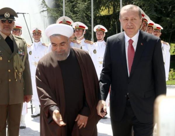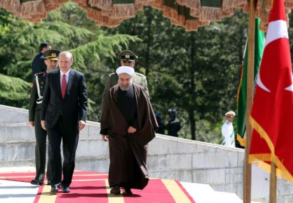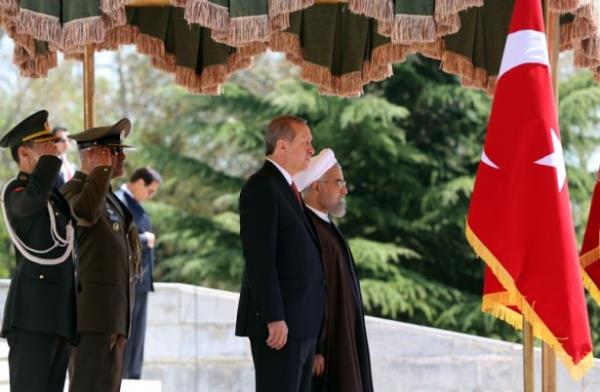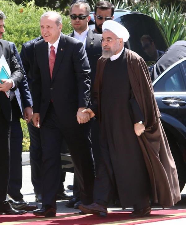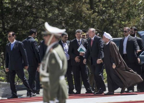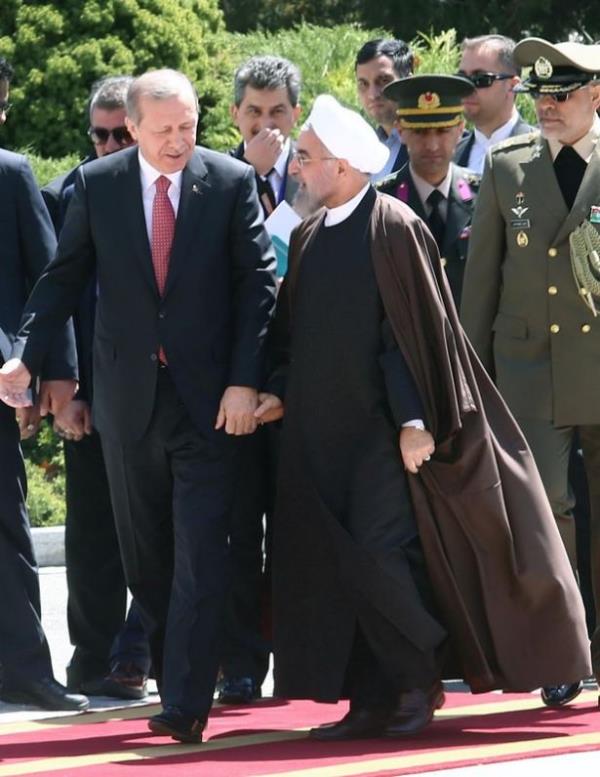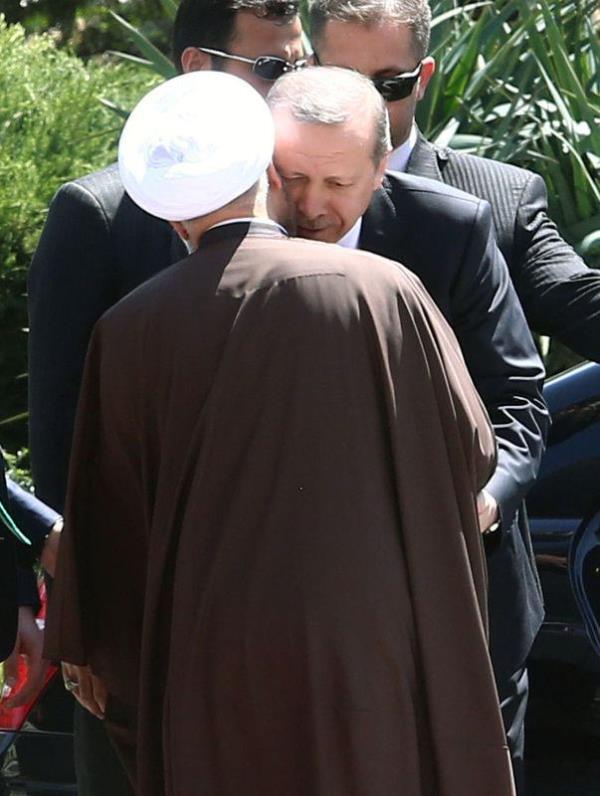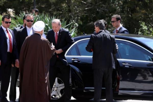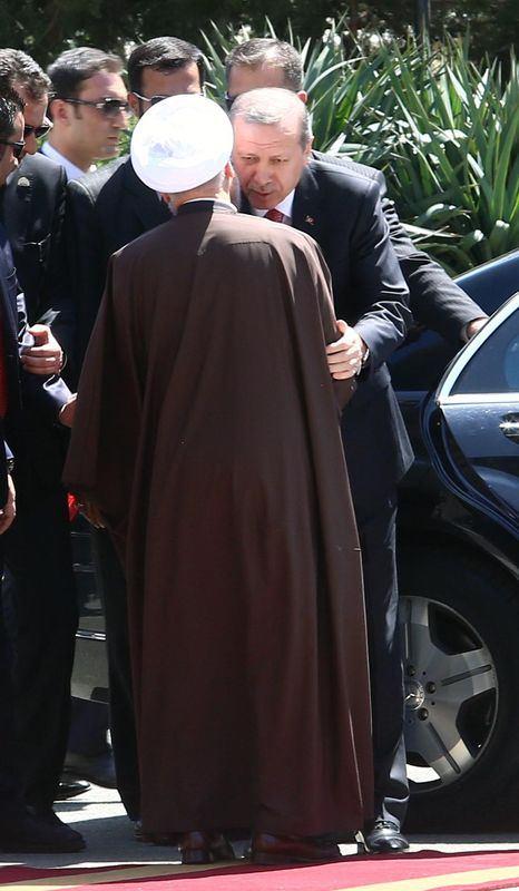 Atlı askerler eşliğinde saray yerleşkesine giren Cumhurbaşkanı Erdoğan'ı törenin yapılacağı alanda İran Cumhurbaşkanı Ruhani karşıladı. Makam aracından inen Erdoğan, Ruhani ile sarıldı. İki liderin bir süre el ele yürümesi dikkati çekti.