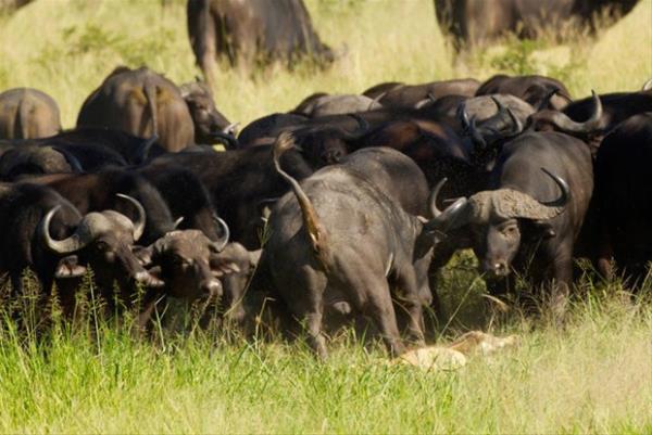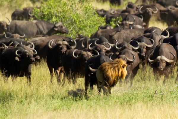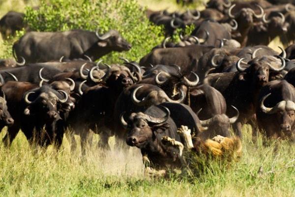 Fotoğraf karelerinde, bir aslan bizon sürüsünün saldırısına uğruyor.