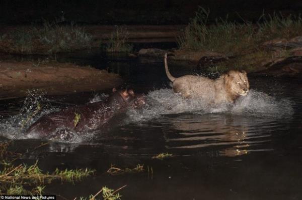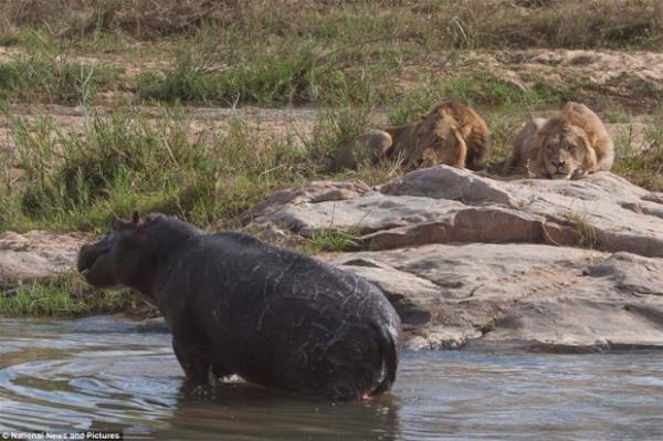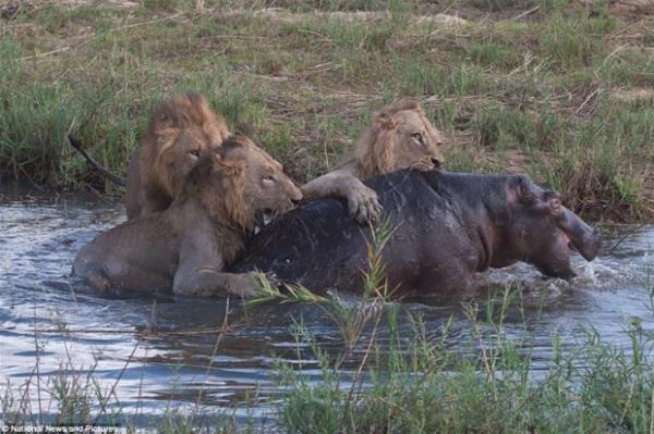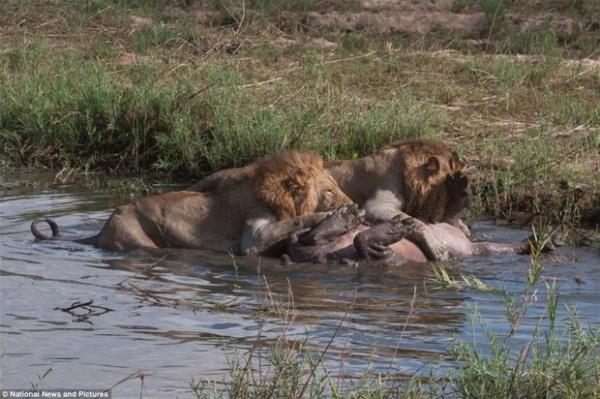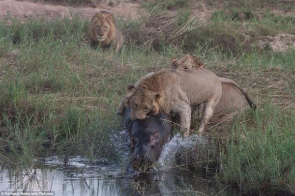 Ve Oyun bitti: Aslanlar 1, hippo 0. Aslanlar zavallı hipopotamı suyun içinde kıstırarak galibiyetlerini ilan etti. -
