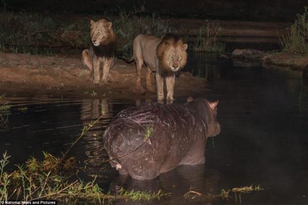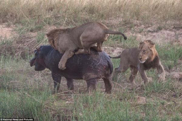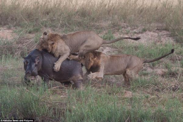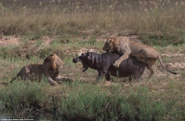 İki aslan bir hipopotama karşı!
