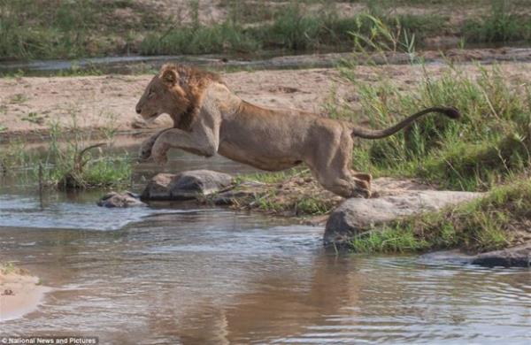 Önce bir darbe alan aslan, hızını artırarak kaçmaya çalışıyor.