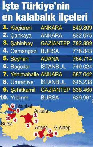 Araştırmada Türkiye'nin en kalabalık 10 ilçesi de belli oldu. Zirvede iki Ankara ilçesi var. İstanbul'un en kalabalık ilçesi ise Bağcılar. Listede yer alan diğer ilçeler ise Bursa ve Gaziantep'ten çıktı. Türkiye'nin en kalabalık ilçesi 840 bin 809 kişiyle Ankara'nın Keçiören ilçesi. Keçiören'in nüfusu Türkiye'nin 66 ilinden daha kalabalık.