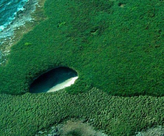 Milyonlarca yıl boyunca kayaların altından tüneller açan deniz suları çayırın ortasında havuz benzeri bir su birikintisi oluşturmuş.