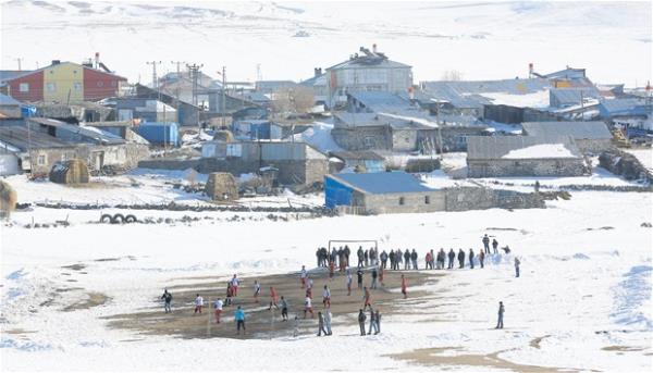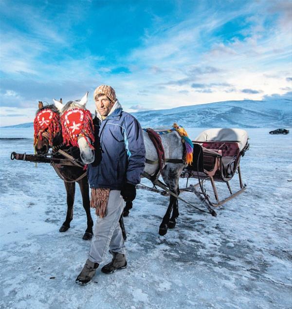Çıldır Gölü buz tutmuş. Kış en çetin şekilde sürüyor. Dışarısı eksi 15 derece. Buz tutmuş Göz üzerindeki kızakçı atlarıyla kameraya gülümsüyor. -