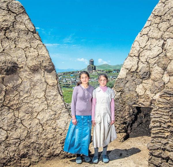 Kağızman’da genç kızlar kışın yakacakları tezekleri kurumaları için üst üste diziyor. Fonda Çengilli Kilisesi var. -