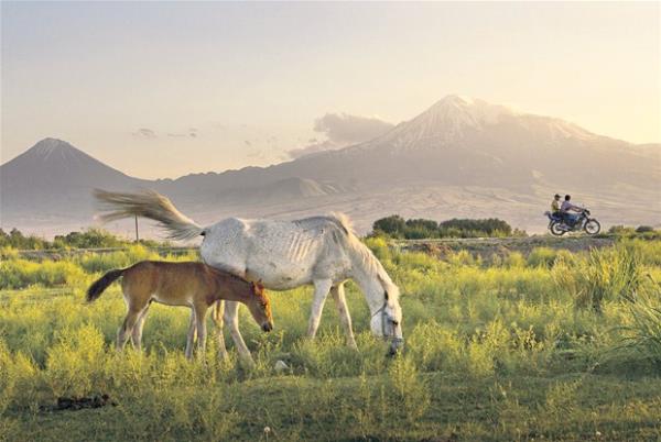 Iğdır’dan tablo gibi bir fotoğraf. Ağrı Dağı ve Küçük Ağrı fonunda, hızla geçen bir motosiklet ve özgür atlar.. -
