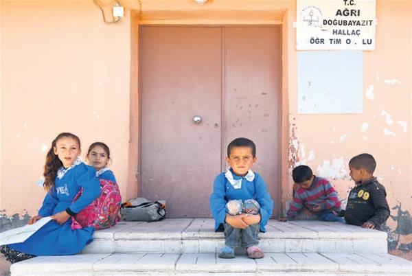 Ağrı Doğubeyazıt’taki Hallaç İlköğretim okulunun boyaları dökülmüş, tabelası eskimiş.. Ama çocuklar bir başka mutlu. -