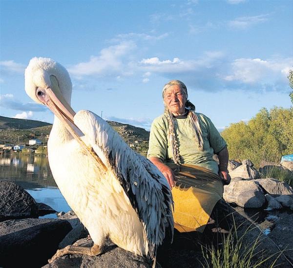 Ardahan’da Çıldır Gölü’ne kıyısı bulunan Akçakale Adası’nda oturan Gülsarı Teyze, torunlarının adlarını verdiği pelikanlarını çiğ balıkla besliyor. -