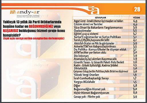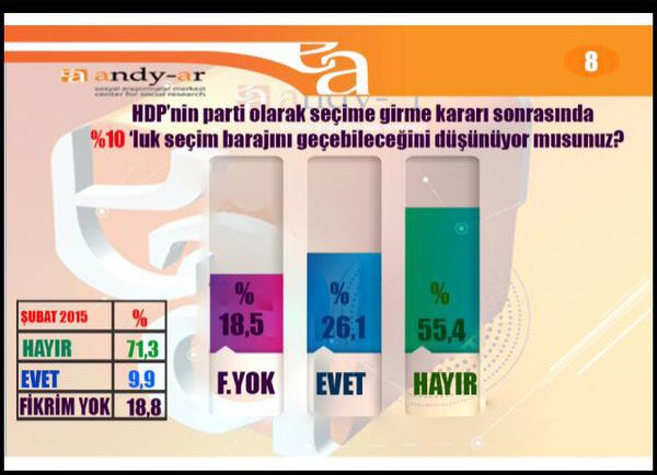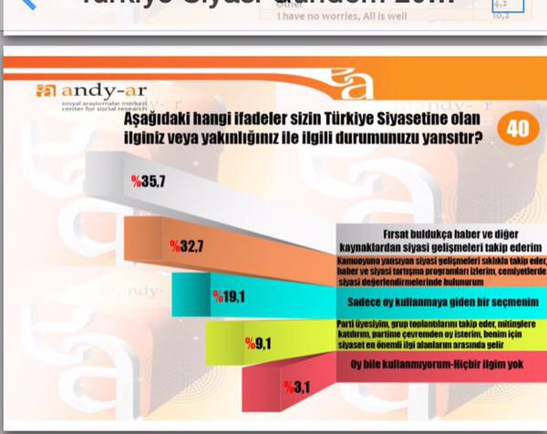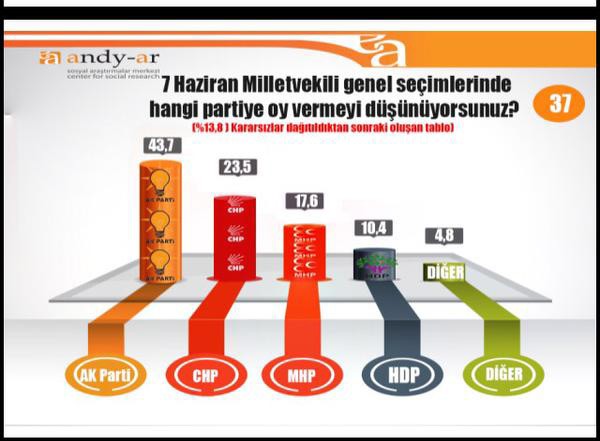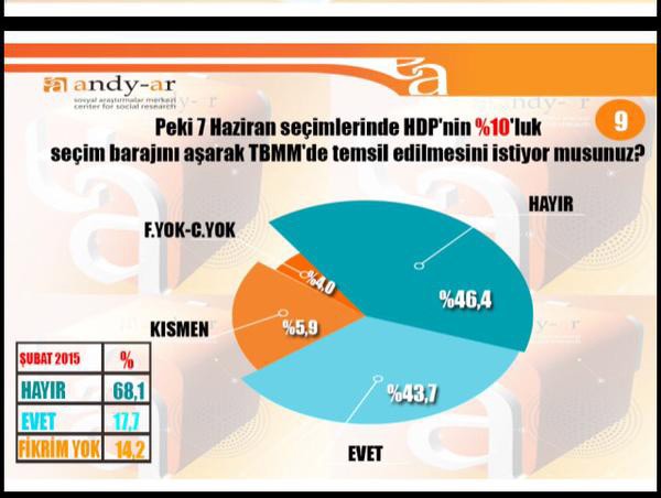 ANDY-AR'ın sahibi Faruk Acar anket şirketinin yaptığı Nisan 2015 anketini Twitter'dan paylaştı. İşte Andy-Ar'ın Nisan 2015 anketi ve sonuçlar: -