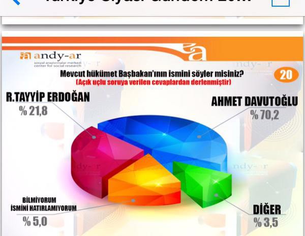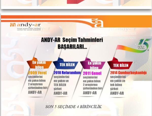 Andy-Ar araştırmanın sahibi Faruk Acar son seçim anketini kamuoyu ile paylaştı. Yaptıkları son araştırmalara göre, oy oranlarında çok fazla bir değişiklik yok ama önümzüde hala 35 gün var diyen Faruk Acar, bu seçimin diğer seçimlerden farklı olduğunu belirtti. Ayrıca ankette sorulan sorulardan "Mevcut Başbakan kimdir?" sorusuna Recep Tayyip Erdoğan şeklince cevap verenlerin yüzdesi 21, Ahmet Davutoğlu şeklinde cevap verenlerin sayısı ise yüzde 70 olarak ortaya çıktı...