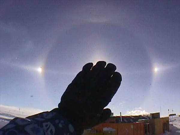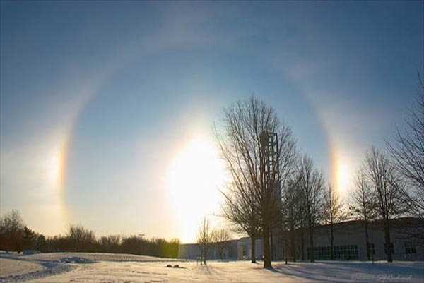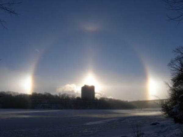 İlginç doğa olayının nedeni ise atmosferdeki buz kristallerinin bulut oluşturması. Bu buz kristalleri atmosferdeki ışığın kırılmasına ve Güneş'in etrafında daire şeklinde iki ışık oluşmasına neden oluyor.