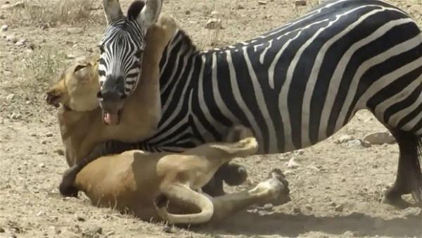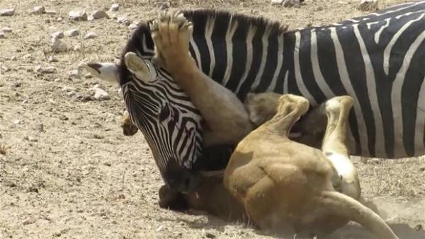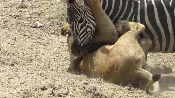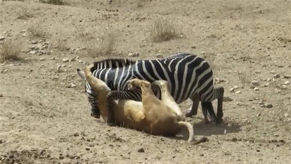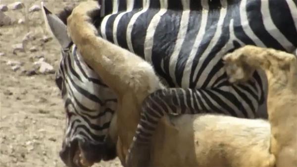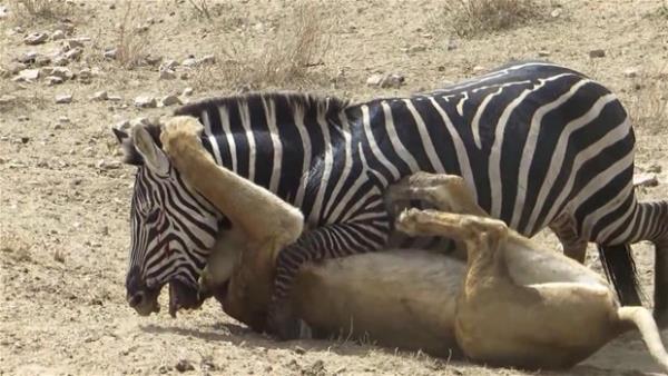 Kendisinden iki kat büyük zebrayı bir türlü devirmeyi başaramayan aslan, avının kendisini ısırmasıyla neye uğradığını şaşırdı.
