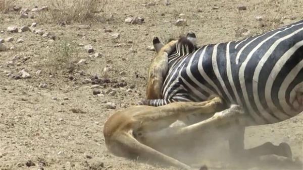 Zebra sürüsünün arasına dalan aslan, yakaladığı avıyla uzun süre cebelleştikten sonra beklenmedik bir olay gerçekleşti.