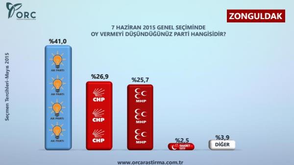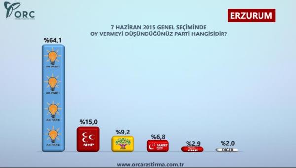 ORC Araştırma son olarak 7 bölgede yer alan İstanbul, Ankara, İzmir, Bursa, Hatay, Diyarbakır, Trabzon, Erzurum, Zonguldak, Afyon, Adıyaman ve Nevşehir'de seçmene, "7 Haziran'da oy vermeyi düşündüğünüz parti hangisidir?" diye sordu.