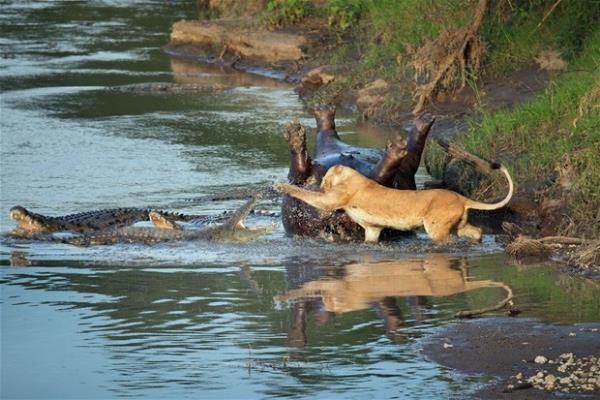 Aslan, yırtıcılığını kullanarak timsahlara kafa tutarken timsahların da pes etmeye niyetleri yoktu. Sonunda aslanın pençeleri galip geldi. Hipopotam aslana yem oldu.