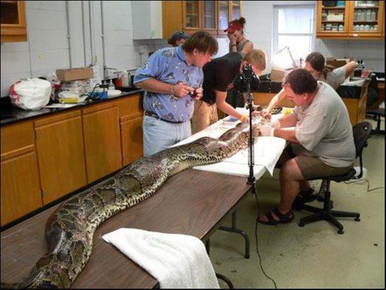 ABD'nin Florida eyaletindeki Everglades Ulusal Parkı'nda yakalanan dev bir Birmanya pitonları, eyalete yerleşen yılanların açtığı sorunun giderek büyüdüğünü gösteriyor.Öldürdükleri pitonun karnını yaran Florida Balık ve Vahşi Hayat Komisyonu egzotik türlerin koordinatörü Scott Hardin, gördükleri karşısında şaşkına döndü.