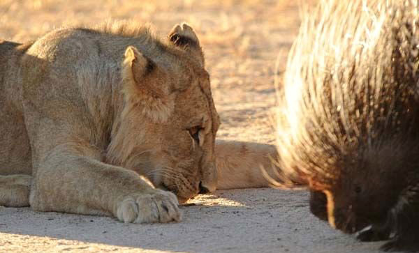 Yavru aslanların kirpilerle imtihanı olaylı bitti.