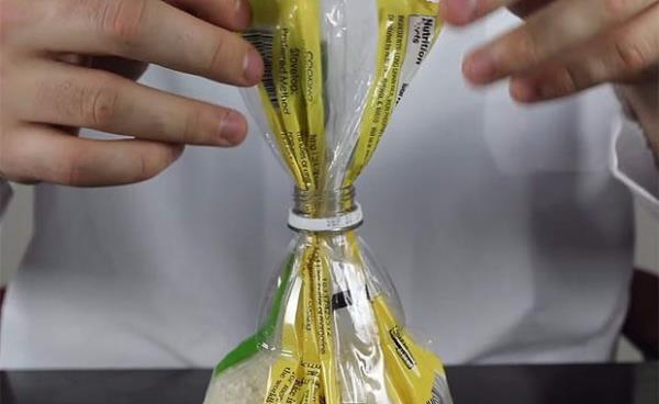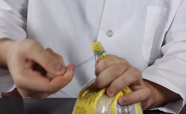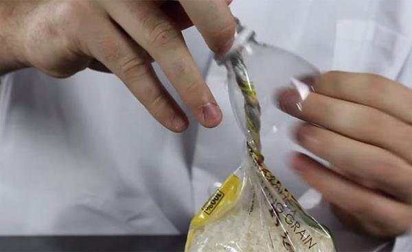 Önce pirinç paketini açıp daha sonra parmağınızla ucundan tutup paketi döndürüyoruz.