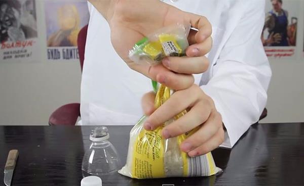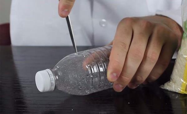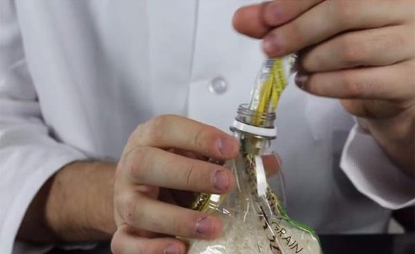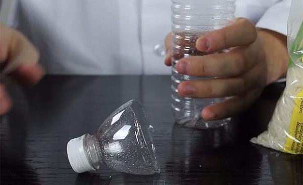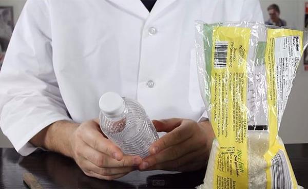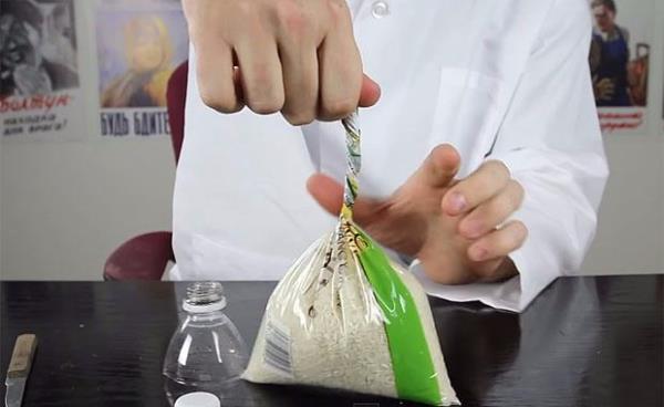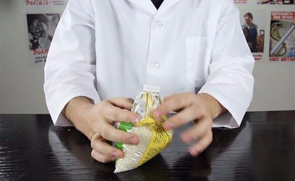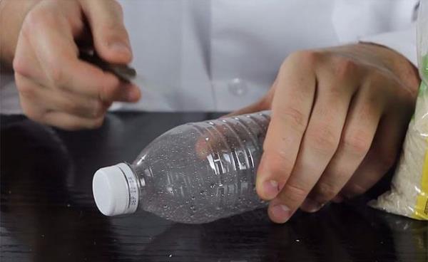 Basit litrelik pet şişe ve pirinç paketi evinizde tek tane dışarı kaçırmadan pirinçleri paketten çıkarabilirsiniz.