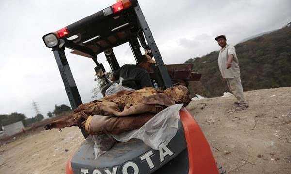 Cesetler, mezarlıktaki bölmelerden çıkarıldıktan sonra poşetlere konuluyor...