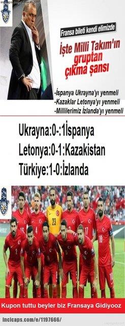 Türkiye İzlanda'yı, Kazakistan da Letonya'yı yenince Fransa'daki Avrupa şampiyonasına direk katılma hakkı kazandık. Türkiye-İzlanda maçı capsleri sosyal medyayı salladı