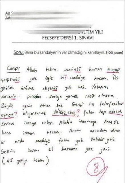Çılgın felsefe hocası 100 puanlık tek soruyu yanındaki sandalyeyi göstererek sorar: - Bana bu sandalyenin var olmadığını kanıtlayın! 100 puan alan tek kişinin cevabı ise sadece şudur: - Hangi sandalye