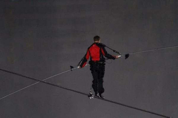 Rüzgar nedeniyle iki kez durmak zorunda kalan ip cambazının elinde sadece dengesini sağlamak için kullandığı 20 kilo ağırlığında uzunca bir çubuk vardı.