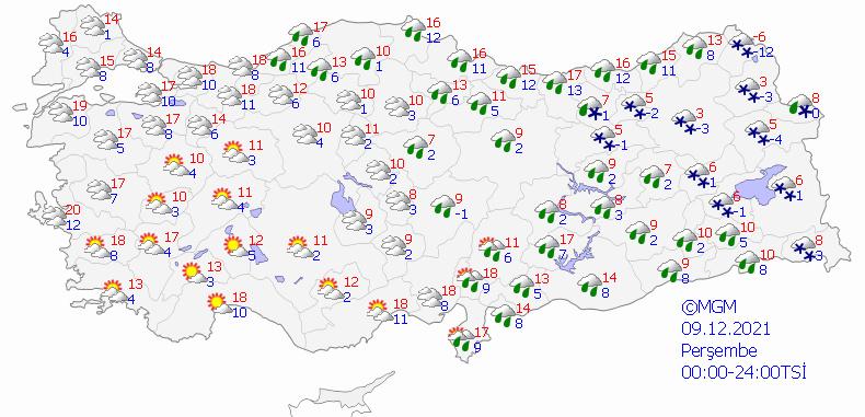Parçalı ve az bulutlu, zamanla çok bulutlu geçeceği tahmin ediliyor. Sabah ve gece saatlerinde buzlanma ve don olayı ile birlikse yer yer sis ve pus hadisesi bekleniyor.