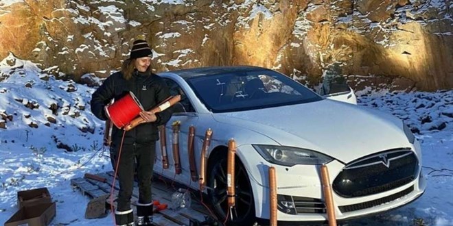 Aracına 30 kilogram dinamit bağlayan ve sürücü koltuğuna da Tesla'nın sahibi Elon Musk'ın cansız mankenini oturtan Katainan, aracını havaya uçurarak sosyal medyada yayınladı.
