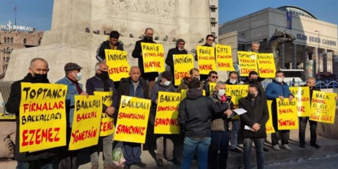Ankara Ulus Heykeli önünde bir araya gelen bakkallar, büyük şirketlerin bazı ürünleri zincir marketlere kendilerinden daha düşük fiyata satmasını, bu nedenle halk arasında bakkalların 'fahiş fiyatçı' olarak görülmesini protesto etti.