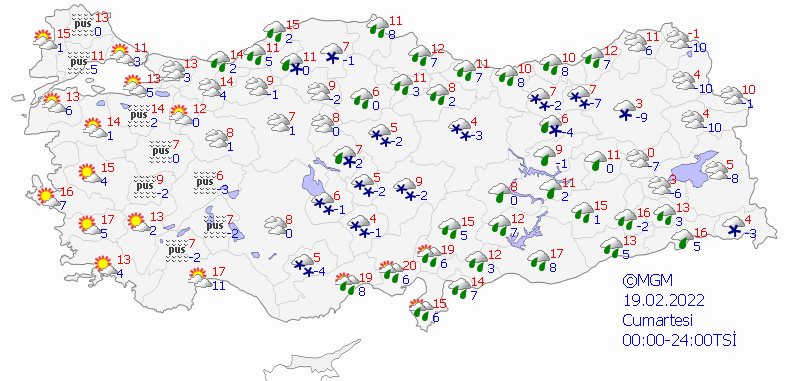 Meteoroloji Genel Müdürlüğü tarafından yapılan son değerlendirmelere göre: Ülkemiz genelinde yağış beklenmiyor. Ülkemizin kuzey ve batı kesimlerinin parçalı ve yer yer çok bulutlu, diğer yerlerin az bulutlu geçeceği tahmin ediliyor. Bu sabah ve gece saatlerinde iç ve doğu kesimlerde buzlanma ve don olayı ile birlikte yer yer pus ve sis hadisesi bekleniyor. Akdeniz Bölgesi'nin yüksek kesimlerinde (Toros Dağları), İç Anadolu'nun güneyinde ve doğusunda (Konya, Karaman ve Niğde'nin Toros Dağları kesimi ile Kayseri ve Sivas'ın yüksek kesimleri), Karadeniz Bölgesi'nin iç ve yüksek kesimleri ile Doğu Anadolu Bölgesi'nde yüksek kar örtüsü bulunan eğimli yerlerde çığ riski bulunmaktadır.