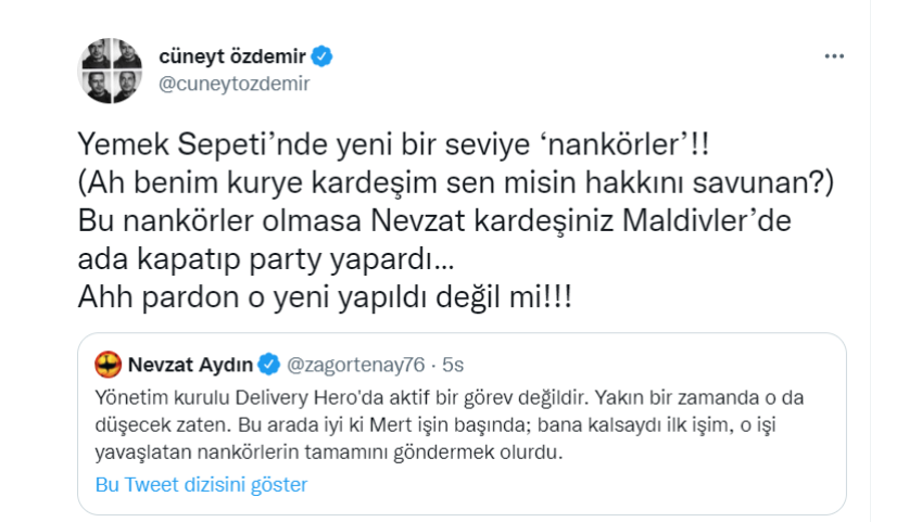 "Yemek Sepeti'nde yeni bir seviye 'nankörler'!! (Ah benim kurye kardeşim sen misin hakkını savunan?) Bu nankörler olmasa Nevzat kardeşiniz Maldivler'de ada kapatıp party yapardı. Ahh pardon o yeni yapıldı değil mi!!!"