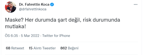 Bakan Koca tweetinde: Maske? Her durumda şart değil, risk durumunda mutlaka! paylaşımında bulundu