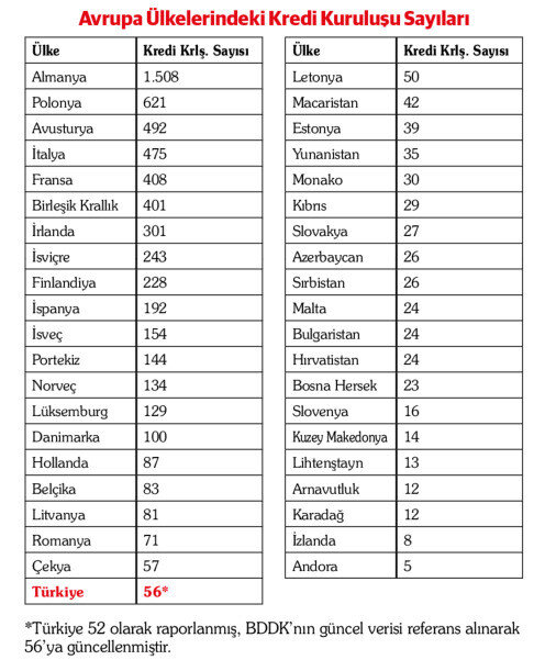 Türkiye'deki 56 bankaya, 22 finansal kiralama, 52 faktöring, 17 de finansman şirketini ekleyelim. Toplam kredi kuruluşu sayısı 150'e yakın. ABD'de mevduat toplamaya yetkili 4 bin 377 banka var, Almanya'da bin 508. Ayrıca Türkiye'de tüm bankalar zaman ve kaynak israfı anlamına gelecek ölçüde global bankadır