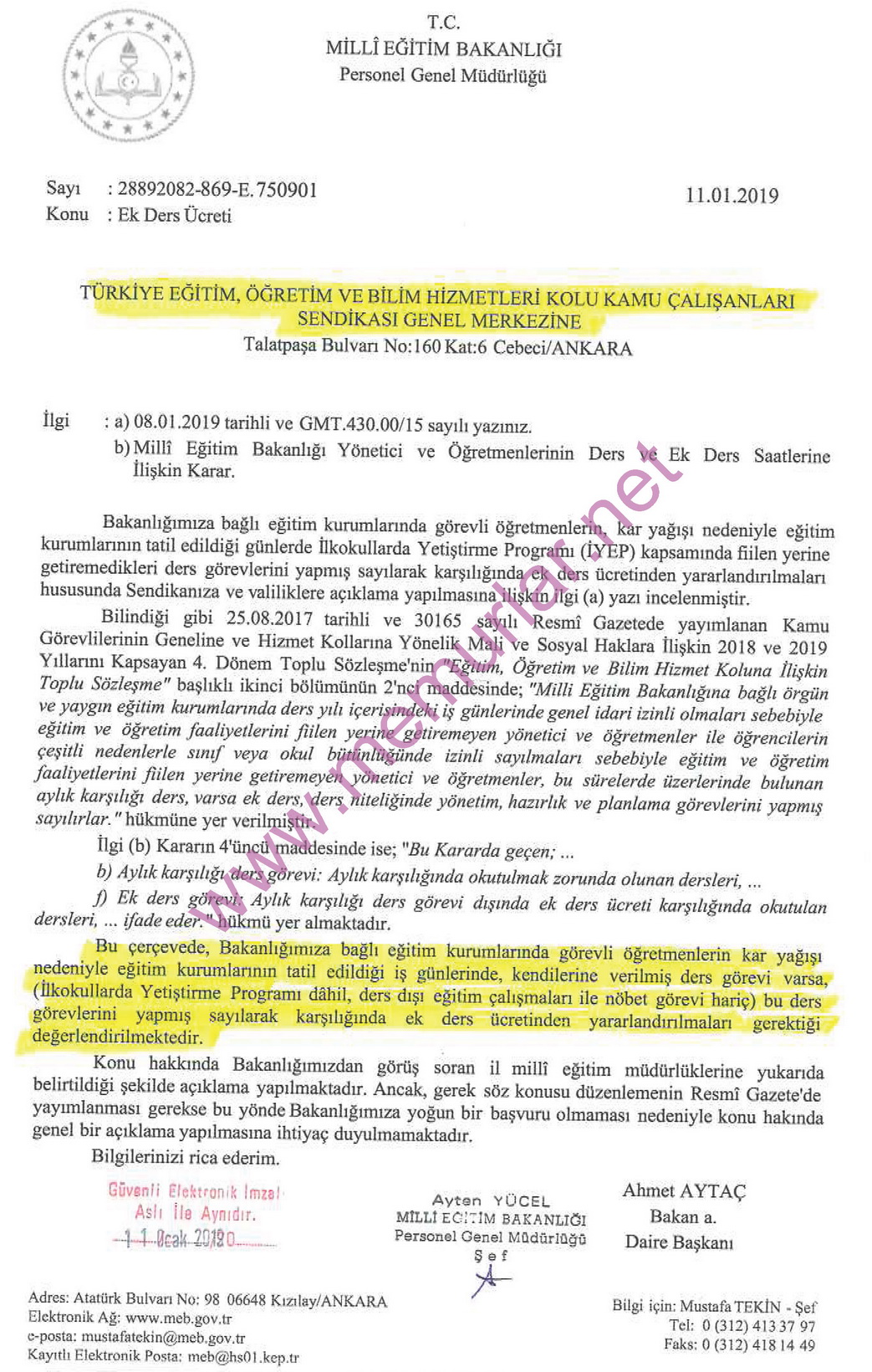 Milli Eğitim Bakanlığının görüş yazısında; "Bakanlığımıza bağlı eğitim kurumlarında görevli öğretmenlerin kar yağışı nedeniyle eğitim kurumlarının tatil edildiği iş günlerinde, kendilerine verilmiş ders görevi varsa, (İlkokullarda Yetiştirme Programı dahil, ders dışı eğitim çalışmaları ile nöbet görevi hariç) bu ders görevlerini yapmış sayılarak karşılığında ek ders ücretinden yararlandırılmaları gerektiği değerlendirilmektedir." açıklamalarına yer verilmiştir.