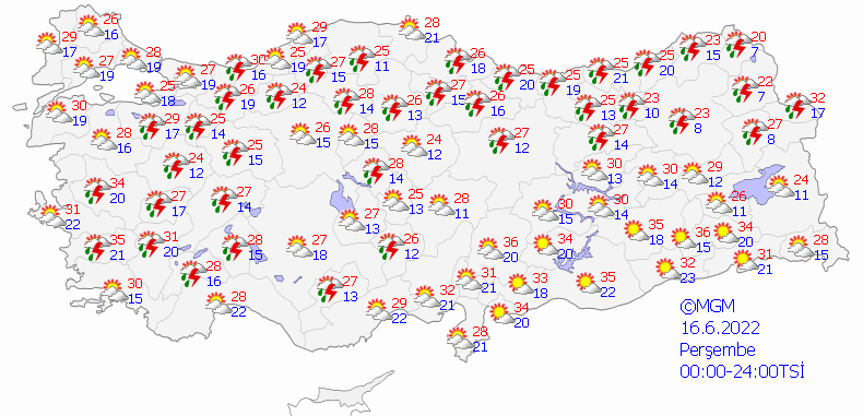 Meteoroloji Genel Müdürlüğü tarafından yapılan son değerlendirmelere göre; Yurt genelinin parçalı ve çok bulutlu, Marmara'nın güneydoğusu, Ege, Akdeniz, İç Anadolu, Batı Karadeniz'in iç kesimleri, Orta ve Doğu Karadeniz, Doğu Anadolu'nun kuzey ve batısı, Edirne, Balıkesir, Sakarya, Sinop, Van, Hakkari, Adıyaman, G. Antep, Kilis, Tekirdağ'ın batı çevreleri ile Çanakkale'nin kuzeybatı kesimlerinin yerel olmak üzere sağanak ve gök gürültülü sağanak yağışlı geçeceği tahmin ediliyor. Yağışların; İç Ege, Batı Akdeniz'in iç kesimleri, Doğu Akdeniz, İç Anadolu ile Orta ve Doğu Karadeniz'in iç kesimlerinde yer yer kuvvetli olması bekleniyor. Rüzgarın; Marmara'nın güneybatısında kuzey ve kuzeydoğu yönlerden kuvvetli (40-60 km/sa), Doğu Anadolu'nun güneybatısında güney ve güneybatı yönlerden kuvvetli ve yer yer kısa süreli fırtına şeklinde (40-80 km/sa) eseceği tahmin ediliyor.
