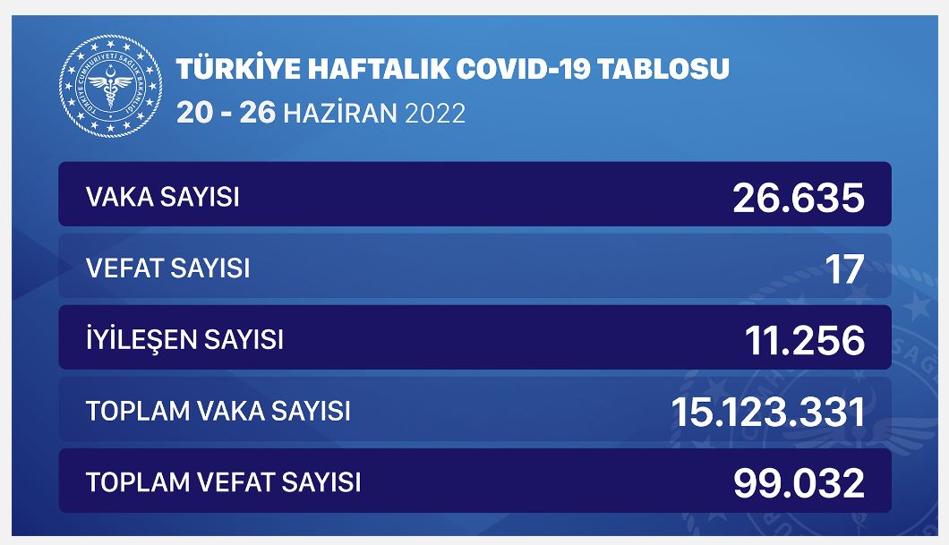 Sağlık Bakanlığının haftalık Kovid-19 verilerine göre, 20-26 Haziran'da 26 bin 635 kişinin testi pozitif çıktı, 17 kişi hayatını kaybetti.