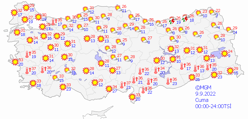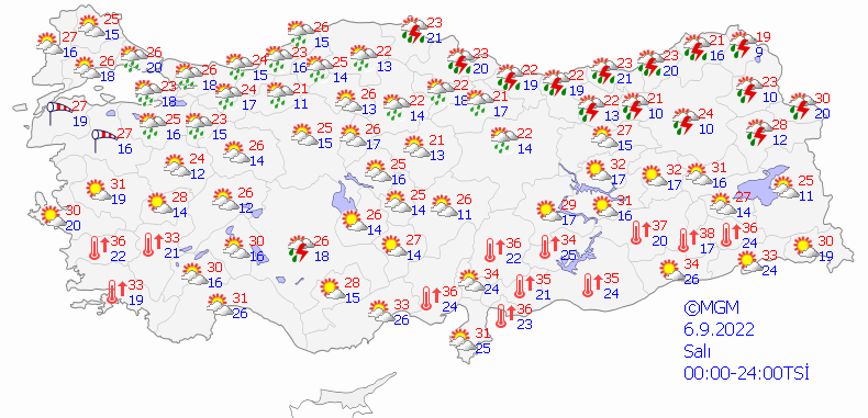 Meteoroloji Genel Müdürlüğü tarafından yapılan son değerlendirmelere göre; Marmara'nın doğusu, Karadeniz, Doğu Anadolu'nun kuzeydoğusu, Sivas çevreleri, Hatay'ın kıyı ilçeleri ile Akdeniz'in Toroslar kesiminin yerel olmak üzere sağanak ve gök gürültülü sağanak yağışlı, diğer yerlerin parçalı ve az bulutlu geçeceği tahmin ediliyor. Yağışların, Orta ve Doğu Karadeniz kıyıları, Erzurum, Kars, Ağrı, Iğdır ve Sinop çevreleri ile Ardahan'ın güney ve Kastamonu'nun kıyı kesimlerinde yerel kuvvetli olması bekleniyor.