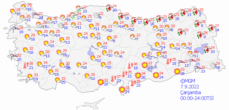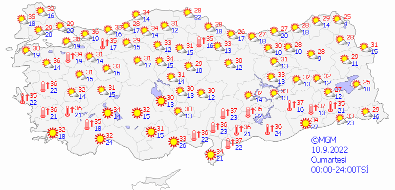 RÜZGAR: Genellikle kuzeyli, Akdeniz kıyıları ile güneydoğu kesimlerde güneyli yönlerden hafif, ara sıra orta kuvvette, Marmara'nın batısı ile Kıyı Ege'de kuzeyli yönlerden, Orta Karadeniz'in iç kesimleri ile Doğu Anadolu'nun güneydoğusunda kuvvetli (40-60 km/sa) esmesi bekleniyor.