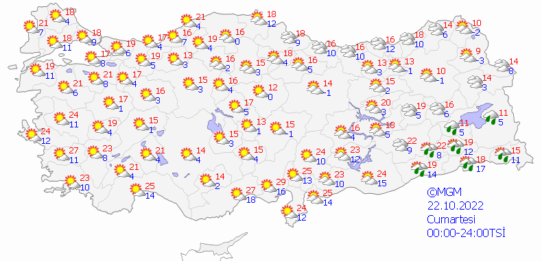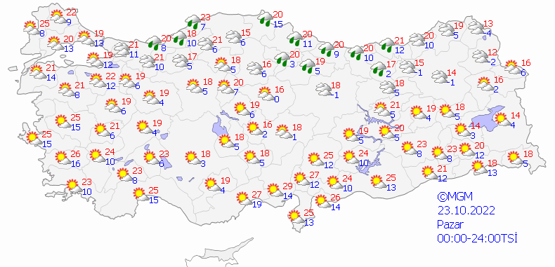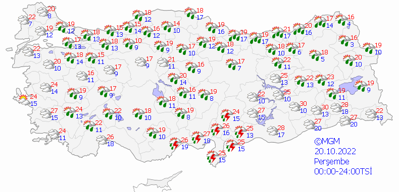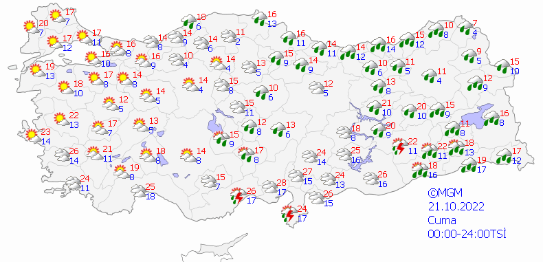 Meteoroloji Genel Müdürlüğü tarafından yapılan son değerlendirmelere göre: Ülkemiz genelinin parçalı ve yer yer çok bulutlu, Marmara'nın doğusu, Batı Akdeniz'in iç kesimleri, Doğu Akdeniz, İç Anadolu'nun güney ve doğusu, Karadeniz, Doğu Anadolu'nun kuzey ve batısı ile Afyonkarahisar, Denizli, Uşak, Kütahya, Eskişehir, Çankırı, Bitlis, Muş, Bingöl, Gaziantep, Kilis, Diyarbakır, Batman, Siirt çevreleri ve Şanlıurfa'nın kuzey ilçelerinin sağanak ve yer yer gök gürültülü sağanak yağışlı geçeceği tahmin ediliyor. Yağışların Doğu Karadeniz kıyıları ile Samsun'un doğusu, Ordu ve Artvin çevreleri ile gece saatlerinden sonra Diyarbakır ve Batman'ın kuzey kesimlerinde kuvvetli ve yer yer çok kuvvetli olması bekleniyor. Rüzgarın: Doğu Anadolu'nun doğusunda güney ve güneybatı yönlerden yer yer kuvvetli ve kısa süreli fırtına (40-80 km/saat) şeklinde esmesi bekleniyor.