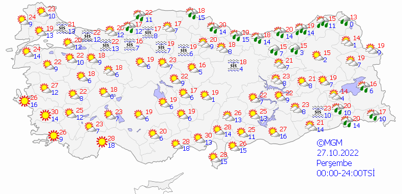 Meteoroloji Genel Müdürlüğü tarafından yapılan son değerlendirmelere göre: Ülkemizin kuzey ve doğu kesimlerinin parçalı ve yer yer çok bulutlu, Güneydoğu Anadolu ile Osmaniye, Kahramanmaraş, Hatay, Bartın, Karabük, Kastamonu, Ordu, Giresun, Malatya, Elazığ, Bitlis, Van, Şırnak ve Hakkari çevreleri ile Trabzon'un batı ilçelerinin yağmur ve sağanak yağışlı, diğer yerlerin az bulutlu ve açık geçeceği tahmin ediliyor. Sabah ve gece saatlerinde Orta Karadeniz'in iç kesimleri ile Doğu Anadolu'da yer yer sis ve pus olayı bekleniyor.