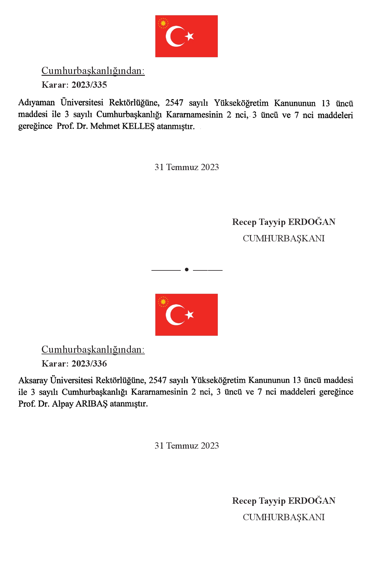 Aksaray Üniversitesi Rektörlüğüne, 2547 sayılı Yükseköğretim Kanununun 13 üncü maddesi ile 3 sayılı Cumhurbaşkanlığı Kararnamesinin 2 nci, 3 üncü ve 7 nci maddeleri gereğince Prof. Dr. Alpay ARIBAŞ atanmıştır.