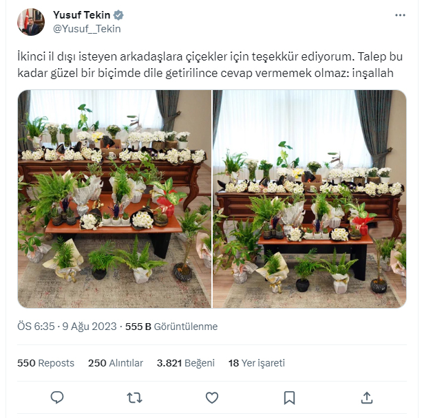 Bakan Tekin "İkinci il dışı isteyen arkadaşlara çiçekler için teşekkür ediyorum. Talep bu kadar güzel bir biçimde dile getirilince cevap vermemek olmaz: inşallah" dedi.
