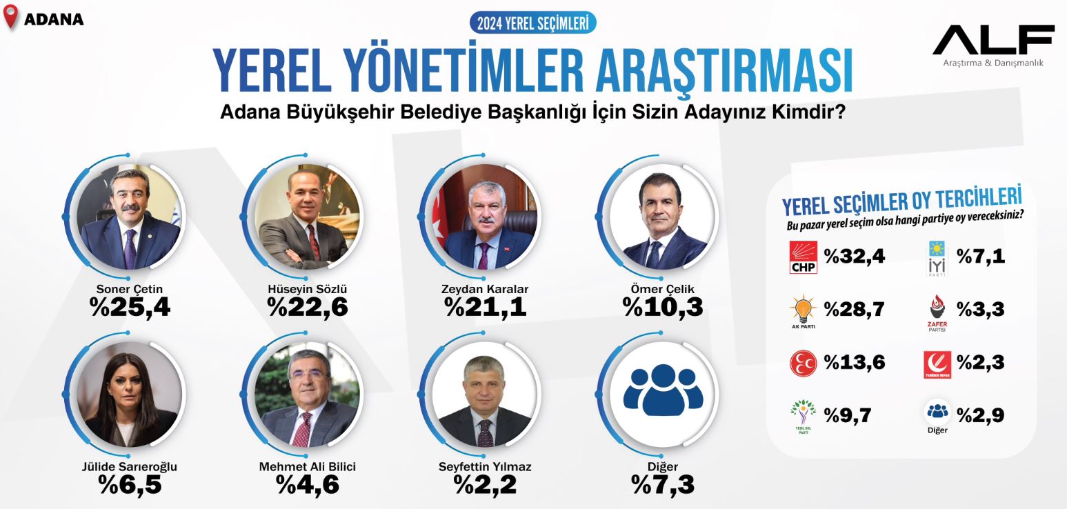 ALF araştırma şirketi, belediye seçimlerinde Adana Büyükşehir Belediyesi için yapmış olduğu anket çalışmasını kamuoyuna açıkladı.