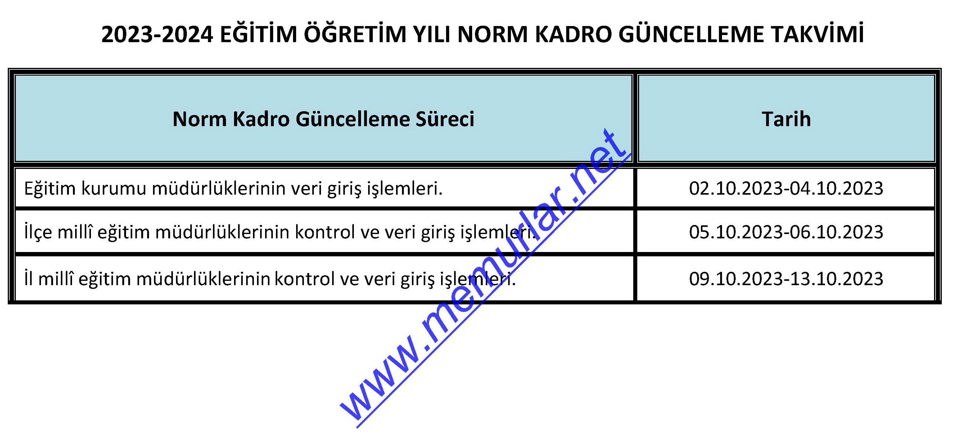 Milli Eğitim Bakanlığı İnsan Kaynakları Genel Müdürlüğünce yayımlanan Norm kadrolarının güncellenmesine ilişkin iş ve işlemler için gerekli hazırlıkların yapılmasını içeren 14.09.2023 tarih ve 84027330 sayılı "Norm Kadro Güncelleme İşlemleri" konulu yazıyı İl Milli Eğitim Müdürlüklerine bildiren Milli Eğitim Bakanlığı, 2023-2024 eğitim öğretim yılına esas olmak üzere, eğitim kurumları tarafından, tüm alanlardaki (branş); ders yükü, norm kadro öğretmen sayısı ve norm fazlası öğretmen sayısının öğretmenlere tebliğ edilerek, 02 Ekim 2023 - 13 Ekim 2023 tarihleri arasında eğitim kurumlarının norm kadrolarının güncellenmesini istemiştir.